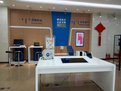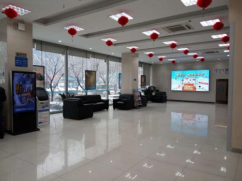 (图三)大堂两侧分别安装了时尚大气的落地一体机,动态宣传着银行多类业务资讯,包括新品、形象宣传片、重大新闻等,绚丽的页面,动态的播放效果,有效吸引客户的眼球,打造银行第一推广窗口。